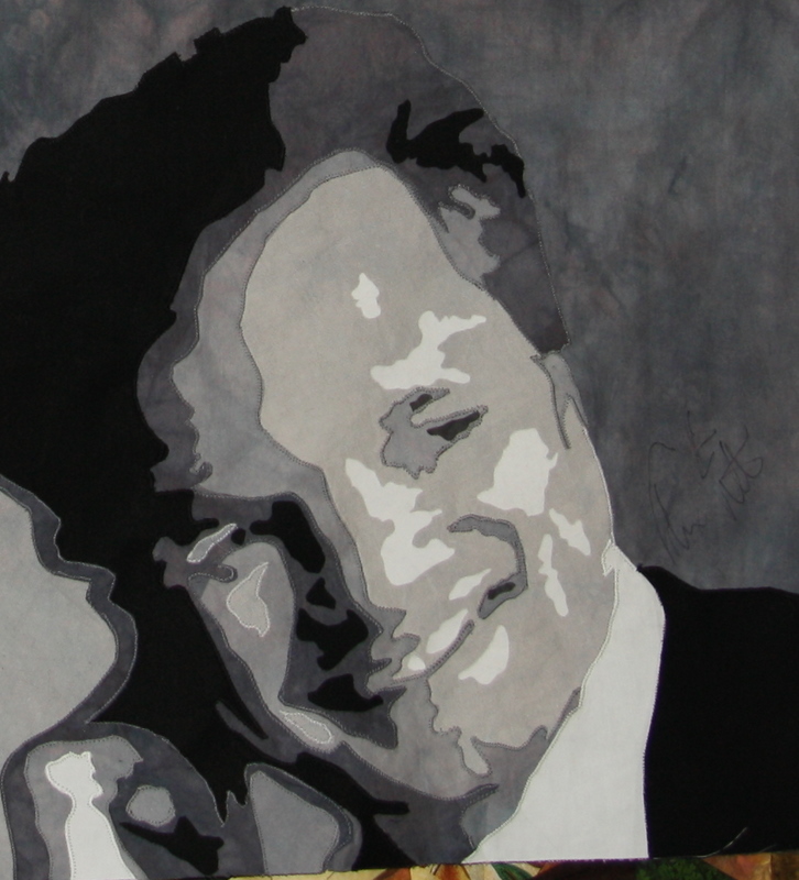 Well, if you look closely at this block, you will see that I finally decided that I would use a small satin stitch to tack down all of the appliqued pieces and I am relatively pleased with how it looks. Now just to get it basted and quilted. Will probably follow the face outlines within the face and use an overall design in each of the backgrounds. I may vary each of the backgrounds -- haven't decided yet as I want the background interesting, but not too interesting!! This is the final block in the top and the one with Colin's signature. The quilt top was derived from a photo taken by Jason Redmond for Reuters in 2009 when Colin was doing an interview about A Single Man. It took me forever to find the attribution of the photo and I have tried to get permission from the photographer through his website and through Twitter but he hasn't answered my inquiries. I really would like to use this top to raise money for Oxfam (in honor of Colin) but would like to have it shown in some regional or national shows. If anyone knows this fellow (he lives in LA), please help me!!