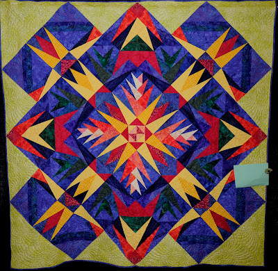 This is another quilt by Mary Wieser called Rain Forest Retreat. Nice used of complementary colors with the bright blue accent. I have tried to use the size of the pictures to show the size of the quilts. You can also look at the labels which are about 4 inches by 6 inches and use that as a guide.