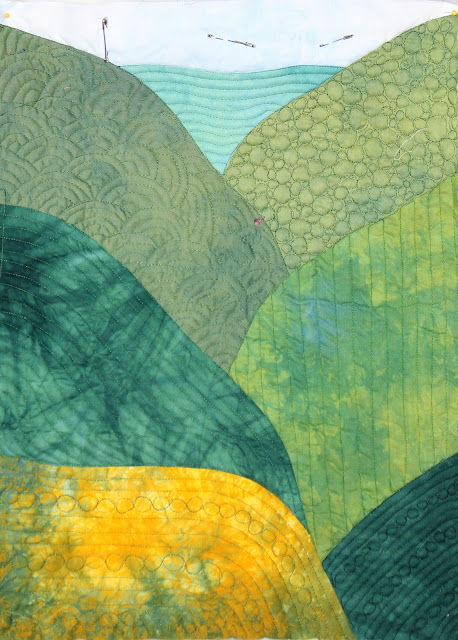 Still cleaning up the sewing room and finishing up projects started years ago. The four pieces here were done in a Cynthia Corbin class. I can't remember what the exercise was but I ended up doing four pieces that looked like the four seasons. This was fall. I am basically practicing my free hand machine quilting which has been kind of fun! Only part left to do on all the pieces is the sky which is small and very easy!!